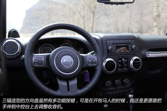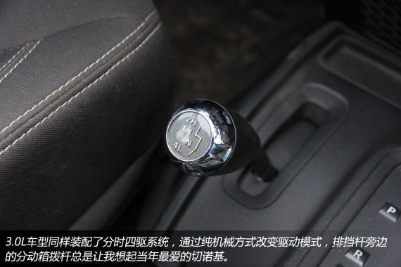 与牧马人的其他车型一样,3.0L车型同样装配了分时四驱系统,通过纯机械方式改变驱动模式,排挡杆旁边的分动箱拨杆总是让我想起当年最爱的切诺基。