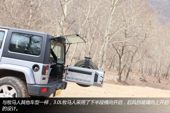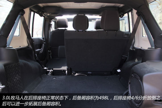 3.0L的牧马人与牧马人的其他车型一样,同样采用了下半部侧开、后风挡玻璃向上开启的尾门设计,后备厢内部的容积也与牧马人其他车型相仿,后排座椅能够4/6分折放倒。