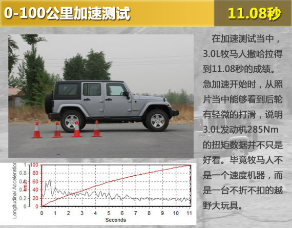 基于厂商提供的试驾车辆,在加速测试当中,3.0L牧马人撒哈拉得到了11.08秒的成绩,对于一台搭载了3.0L发动机的车型来说,这个成绩显然不够理想,3.0L发动机相比3.6L发动机还是显得稚嫩了一些,不过日常驾驶已经足够。急加速开始时,从照片当中能够看到后轮有轻微的打滑,说明3.0L发动机285Nm的扭矩数据并不只是好看,对于推动这个大铁盒子还是有非常积极的作用。毕竟牧马人不是一个速度机器,而是一台不折不扣的越野大玩具,所以对于加速性能不能有太多的苛求。