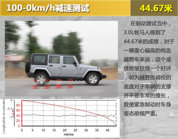 制动测试当中,3.0L牧马人得到了44.67米的成绩,对于一辆重心偏高的纯血越野车来说,这个成绩能够获得一个好评,但为越野而调校的底盘对于车辆的支撑并不是非常的擅长,致使紧急制动时车身姿态前倾严重。