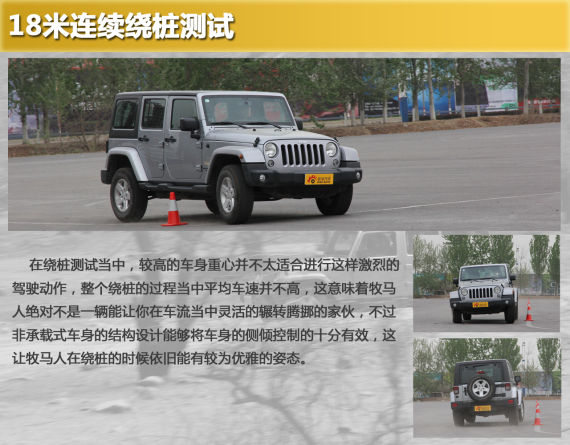 绕桩测试当中,较高的车身重心并不太适合进行这样激烈的驾驶动作,整个绕桩的过程当中平均车速并不高,这意味着牧马人绝对不是一辆能让你在车流当中灵活的辗转腾挪的家伙,不过非承载式车身的结构设计能够将车身的侧倾控制的十分有效,这让牧马人在绕桩的时候依旧能有较为优雅的姿态。