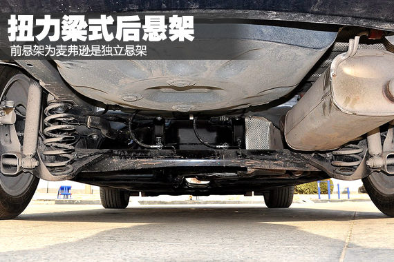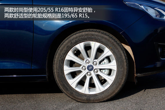 从图中不难看到横在两后轮之间的钢梁,受限于车型定位,福睿斯的后悬使用了扭力梁结构。不过同样是扭力梁,也能分出个高低上下来。从驾乘体验上讲,福睿斯的后悬架减震做得比较到位,可以有效过滤掉一般的路面细碎颠簸。但是斜向驶过减速带时,一侧车轮的跳动还是会被另一侧乘员明显察觉。