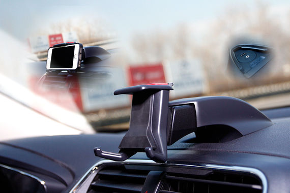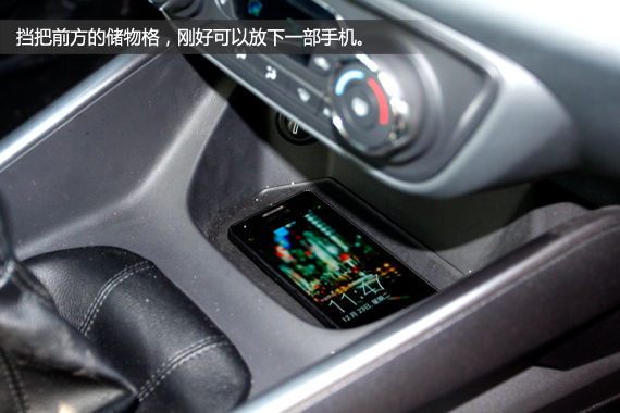 福睿斯没有中央显示屏,怎么办呢?聪明的厂家用一个支架来代替。中央出风口上方有个扣盖,抠开之后可以把支架固定在中控台正中央,可调节大小的卡口能固定住手机和一些导航系统。