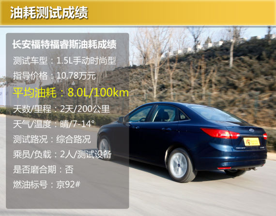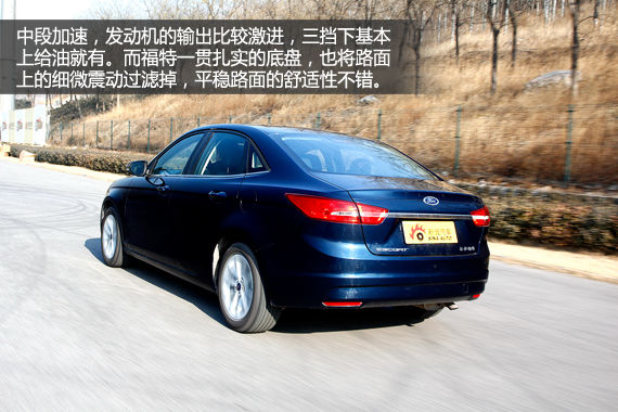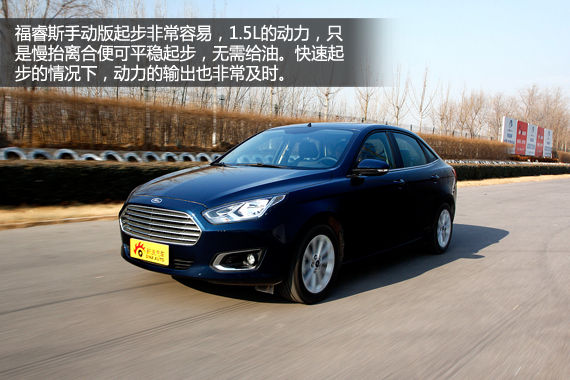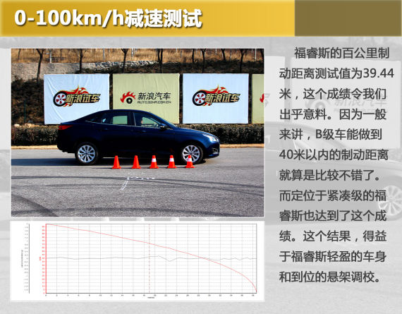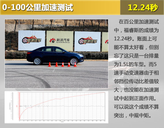 在百公里加速测试中,福睿斯的成绩为12.24秒。从照片中可以看出,起步一瞬间车辆对抬头的控制还是很好的。前轮经过短暂的打滑,车辆便开始全力加速。加速过程中,由于变速器挡位非常清晰,试车手可以充分发挥能力,但由于这台变速器的换挡行程不短,造成了挡间动力过多地白白流失掉,这是手动版福睿斯加速测试中最受限的方面。