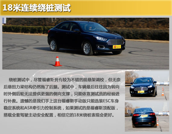绕桩测试中,尽管福睿斯拥有较为不错的前悬架调校,但无奈后悬扭力梁结构仍然拖了后腿。测试中,车辆最后往往因为转向时外侧后轮无法提供更强的侧向支撑,只能依靠测试员的经验进行补救。遗憾的是我们手上这台福睿斯手动版只能选装ESC车身稳定系统和ASR牵引力控制系统,如果测试的是福睿斯顶配版,搭载全套驾驶主动安全配置,相信它的18米绕桩表现会更好。