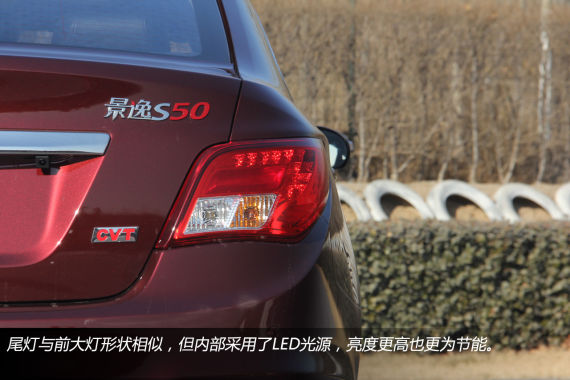 景逸S50的车尾造型与车头风格保持了一直,同样是实用、平和为主的设计基调,尾灯内部采用了LED光源,这一点值得称赞。车牌框上方的镀铬装饰则起到了很好的点缀作用。