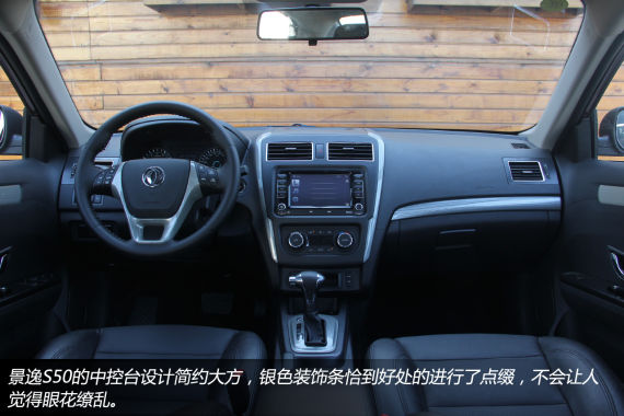 坐入景逸S50的车内,整体内饰的风格依旧坚持了简洁、实用的风格,我们所拍摄的这辆试驾车采用了全黑色的内饰配色方案,黑色的中控台上设计有银色装饰,使车内的整体视觉氛围并不单调。