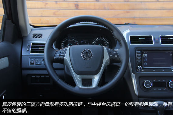 真皮包裹的三辐样式方向盘与景逸X3和X5上装配的方向盘样式接近,但方向盘正中央的标志却换成了更有历史的东风双飞燕标志,老一辈人的东风情节在这里很容易被唤醒。左右两侧多功能按键是非常讨人喜欢的配置,开车听广播或者U盘里音乐的时候手不需要离开方向盘就能实现选曲或者调节音量的操作。