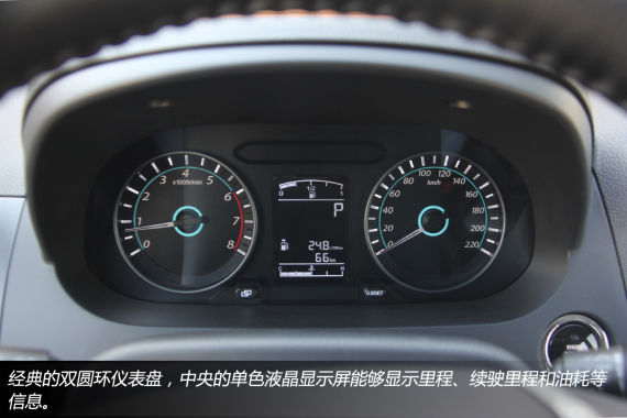 仪表盘采用了经典双圆环设计,位于时速表和转速表之间的单色液晶显示屏能够显示里程、油耗等信息,同时水温表、油量表也都被整合进了这块单色液晶显示屏,能够显示的信息内容还算足够。