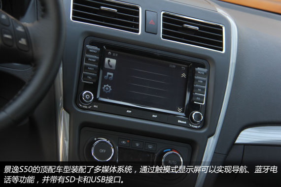我们评测的这辆景逸S50顶配车型,中控台上装配了触摸式液晶显示屏,能够实现导航、多媒体、蓝牙电话等功能,并且带有USB接口以及SD卡插槽,实用性较高。另外值得肯定的是景逸S50的顶配车型配备了单温区自动恒温空调,相比手动空调更显档次。