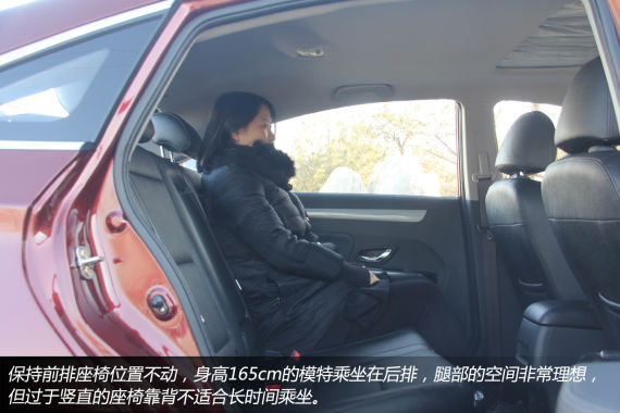 身高165cm的模特将座椅调整至自己最为舒适的坐姿之后,左右两侧空间较为充裕,虽然中央扶手的位置偏低,但对于降低疲劳程度还是能够起到一定作用的。保持前排座椅位置不动,模特乘坐在驾驶座椅后方,受制于车身外观造型的愿意,头部距离车顶空间仅有一拳,但膝盖与前排座椅靠背之间的距离绝对能够算得上舒适。