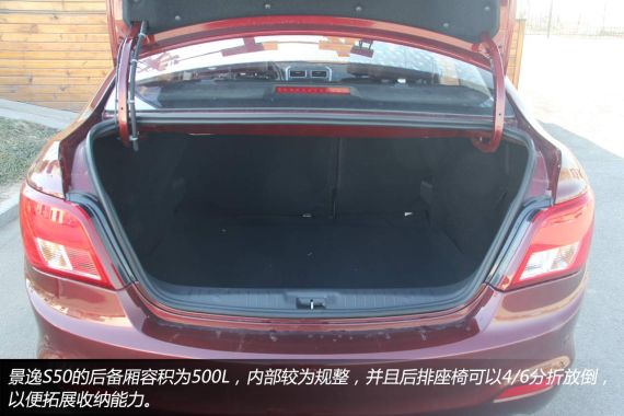 景逸S50的后备厢在后排座椅正常状态下容积为500L,通过4/6分折放倒后排座椅之后,可以进一步拓展后备厢的实际容纳能力。