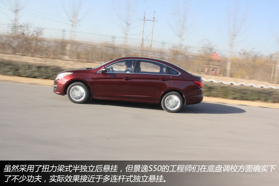景逸S50在底盘上采用了前麦弗逊式独立悬挂和后扭力梁式半独立悬挂的布局,并且前、后悬挂都带有横向稳定杆。采用扭力梁式半独立悬挂的好处在于能够节约底盘空间,以便能够让车内获得更多的实际乘坐空间。并且,景逸S50的工程师们在这款车的底盘调校方面确实下了不小的功夫,尽管采用了扭力梁式半独立悬挂,但实际使用效果却非常理想。