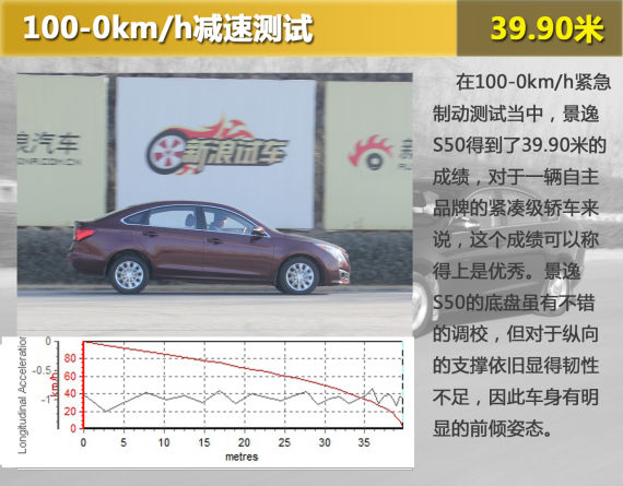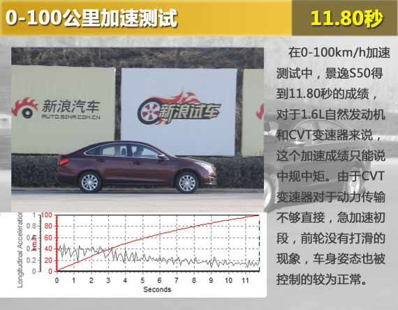 在0-100km/h加速测试当中,景逸S50得到了11.80秒的成绩,对于一台搭载了1.6L自然发动机和CVT变速器的车型来说,这个加速成绩只能说中规中矩,但当发动机到达峰值扭矩转速之前,加速初段似乎被隐藏起来的实力才逐渐展现出来,表现出典型日系发动机高转速发力的特点。由于CVT变速器对于动力传输不够直接,因此在急加速初段,景逸S50的前轮不会出现打滑的现象,车身姿态也被控制的较为正常。