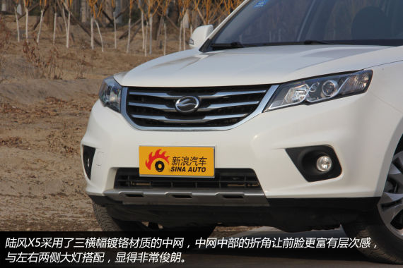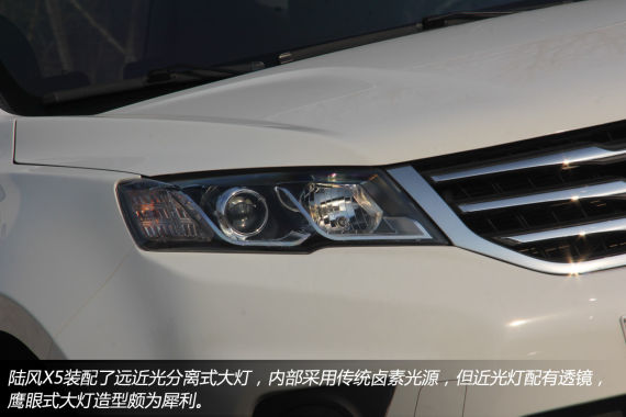三横幅造型的镀铬中网使陆风X5的车头看起来格外的俊朗,与左右两侧的鹰眼式大灯搭配起来具有不错的视觉效果,大灯内部虽然只采用了传统的卤素光源,但近光灯配有透镜。前保险杠下方的银色护板让陆风X5增加了不少野性的气质。