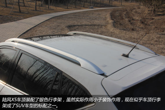 陆风X5的车身侧面采用了双腰线的设计,前风挡玻璃倾角较大,有利于实现更为优秀的空气动力学性能。作为一辆SUV车型,如果车顶没有配备行李架,似乎是不完整的一辆SUV,陆风X5的车顶装配了银色的行李架,虽然实际作用远远小于装饰作用,但视觉效果确实得到了提升。