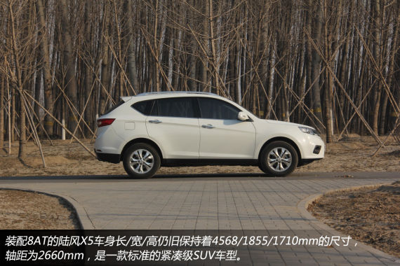 在外观上,搭载了8AT变速器的陆风X5与之前推出搭载6速手动变速器的车型保持了较高的一致性,车身长/宽/高仍旧保持着4568/1855/1710mm的尺寸,轴距为2660mm,是一款标准的紧凑级SUV车型。