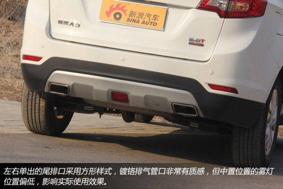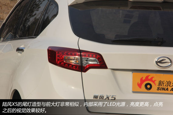 陆风X5的车尾设计简洁大方,黑色保险杠和下方的银色护板显得野性十足,左右两侧的尾灯造型与前大灯风格统一,内部采用了LED光源,点亮之后的视觉效果出色。美中不足的是,车尾仅设置了一个雾灯,位于保险杠下方正中,位置偏低,使实际使用效果打了个折。