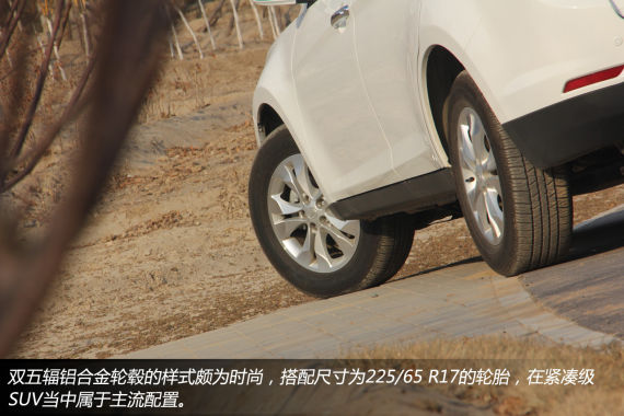 陆风X5装配了双五辐样式的铝合金轮毂,轮胎尺寸为225/65 R17,在同级别车型当中,这样的轮胎尺寸属于主流配置。