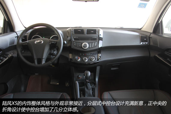 陆风X5的内饰整体风格与外观非常接近,分层式中控台设计充满新意,正中央的折角设计使中控台增加了几分立体感,但中央空调出风口的高度偏高,在坐姿偏低的时候会出现遮挡视线的情况。