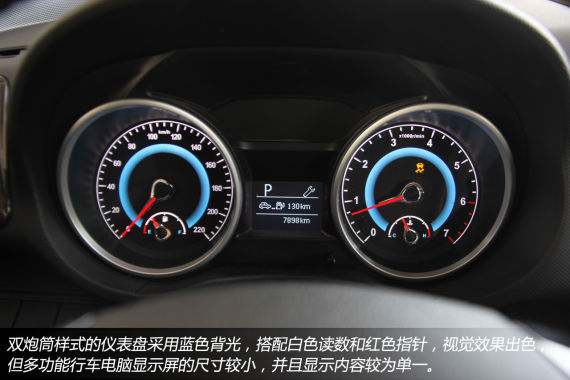 造型简洁的三幅方向盘采用真皮材质包裹,左右两侧的多功能按键周围配有钢琴烤漆材质的装饰,虽然看起来美观,但非常容易留下恼人的指纹。陆风X5的内饰,我最为喜欢的是仪表盘,双炮筒样式的仪表盘配合冰蓝色的背光,显得十分清爽,但中间的多功能行车电脑显示屏尺寸太小,并且能够显示的信息数量十分有限。