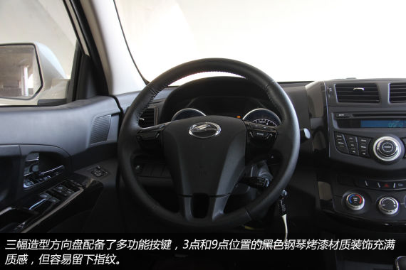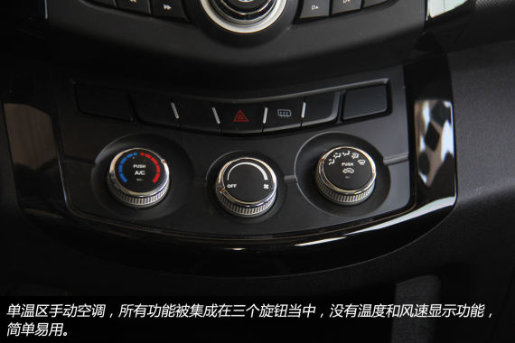 即便是我们试驾的这辆顶配车型,也没有装配导航系统,好在简单的多媒体机头带有USB接口和SD卡插槽。多媒体面板上的按键设计更多的是为了实现左右两侧对称,实际上通过方向盘的多功能按键就能实现几乎所有的功能。出于成本方面的原因,陆风X5仅装配了手动空调,三个简单的旋钮即可实现所有的功能。