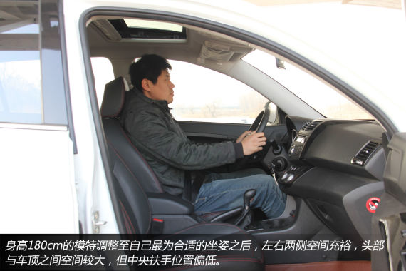 身高180cm的模特在调整至自己最为合适的坐姿之后,前排左右两侧的空间仍旧充裕,并且能够获得不错的前方视野,头部与车顶之间尚有一定的距离,但中央扶手偏窄,因此前排主、副驾驶同时使用中央扶手的时候会显得有些拥挤。