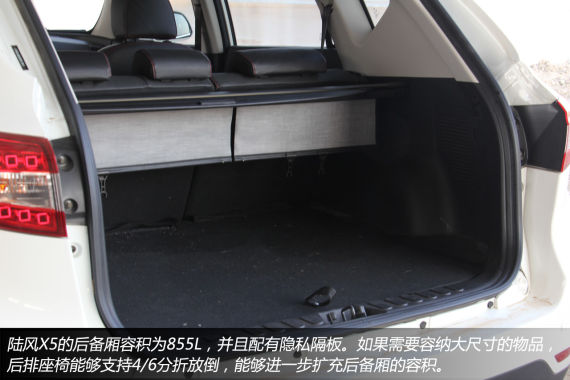 保持主驾驶座椅位置不动,身高180cm的模特乘坐在后排,能够获得不错的乘坐空间。模特头顶与车顶之间的距离超过一拳,膝盖与前排座椅靠背之间的距离同样超过一拳。在紧凑级SUV当中,陆风X5的后排实际乘坐空间较为理想。