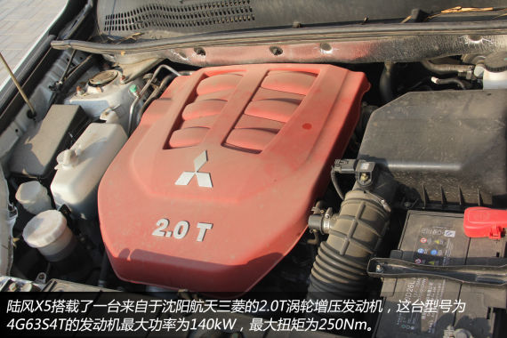 陆风X5搭载了一台来自于沈阳航天三菱的2.0T涡轮增压发动机,这台型号为4G63S4T的发动机采用了双顶置凸轮轴的布局,在5500rpm时可以输出140kW的最大功率,在2800-4400rpm的宽泛区间内可以输出250Nm的最大扭矩。在自主品牌的紧凑级SUV车型当中,陆风X5的这台2.0T发动机在排量上比竞争对手更大,同级别车型大多搭载1.5T或者1.8T发动机。
