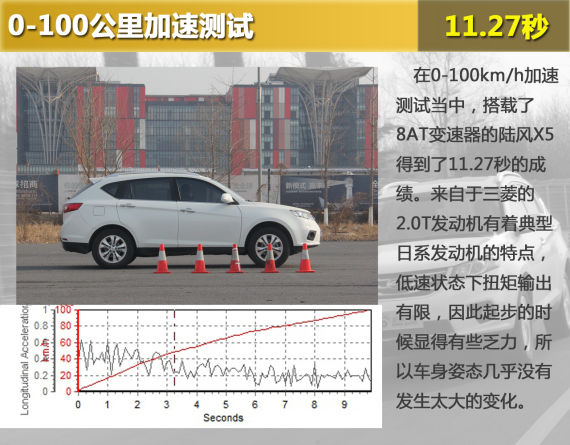 在0-100km/h加速测试当中,搭载了8AT变速器的陆风X5得到了11.27秒的成绩。这台来自于三菱的2.0T发动机有着典型日系发动机的特点,低速状态下扭矩输出有限,因此起步的时候显得有些乏力,当转速突破2000rpm时才逐渐开始发力,所以车身姿态几乎没有发生太大的变化。