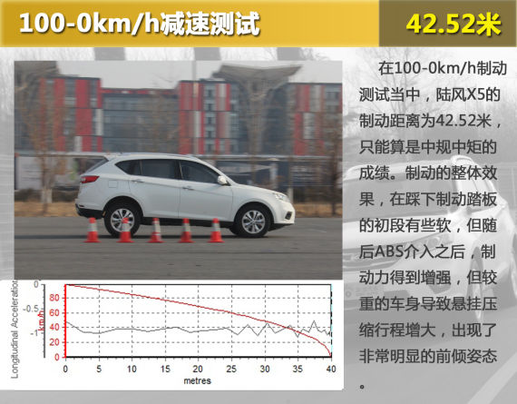 在100-0km/h制动测试当中,陆风X5的制动距离为42.52米,只能算是中规中矩的成绩。制动的整体效果,在踩下制动踏板的初段有些软,但随后ABS介入之后,制动力得到增强,但较重的车身导致悬挂压缩行程增大,出现了非常明显的前倾姿态。