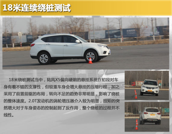 绕桩测试当中,陆风X5偏向硬朗的悬挂系统在初段对车身有着不错的支撑性,但较重车身会增大悬挂的压缩行程,加之采用了前置前驱的布局,转向不足的趋势非常明显,影响了绕桩的整体速度。2.0T发动机的涡轮增压器介入较为明显,扭矩的突然增大对于车身姿态的控制起到了反作用,整个绕桩的过程并不线性。
