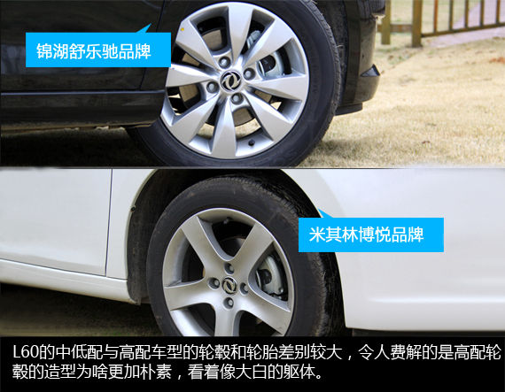L60的高配车型和中低配车型之间的轮毂造型和轮胎品牌有着不小的差别,中低配车型配备的是多幅式铝合金轮毂和锦湖舒乐驰SA01轮胎,规格为205/55 R16,市面售价约为440元。而高配车型配备的是五幅式铝合金轮毂和米其林博悦轮胎,规格为215/50 R17,市面售价约为870元。