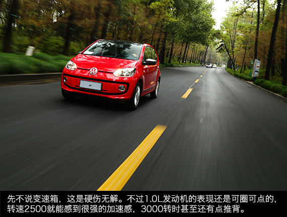 up!汽油版搭载了一台1.0L直列三缸自然吸气发动机,最大功率55kW。这台发动机也是大众全EA211系列中最新的一台,它的涡轮增压版已经搭载在全新奥迪A1上。这台1.0L发动机的动力可以说非常不错,2500转时动力开始爆发,3000转时甚是有点疯狂。对于不到1吨的up!来说,动力完全够用。