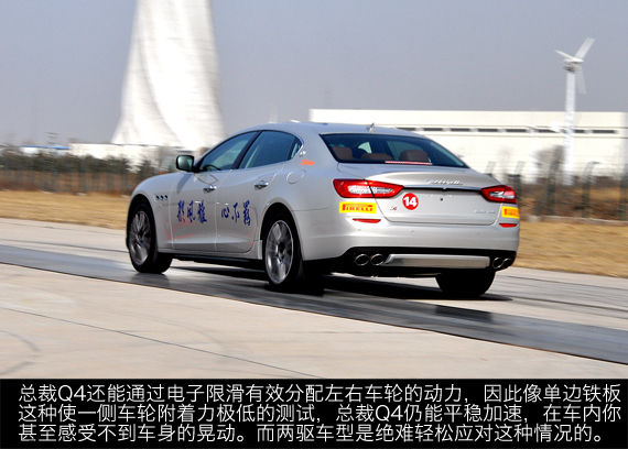 高速过弯时,总裁Q4的底盘相当紧绷,由于悬架本身偏硬,车身侧倾并不明显。总裁Q4的前悬采用双叉臂结构,后悬为五连杆结构,因此车头在弯道中的支撑力、前轮与地面的垂直度都保持得不错。四驱车型在弯道出弯给油的一瞬间,确实与两驱车型差别很大,主要在于你可以放心大胆地给足油门,而不用担心甩尾甚至失控,当然喜欢甩尾的同学就另说了。相比之下,我个人是更青睐于四驱车型提供的高弯道极限,那种踏实的自信难以名状。