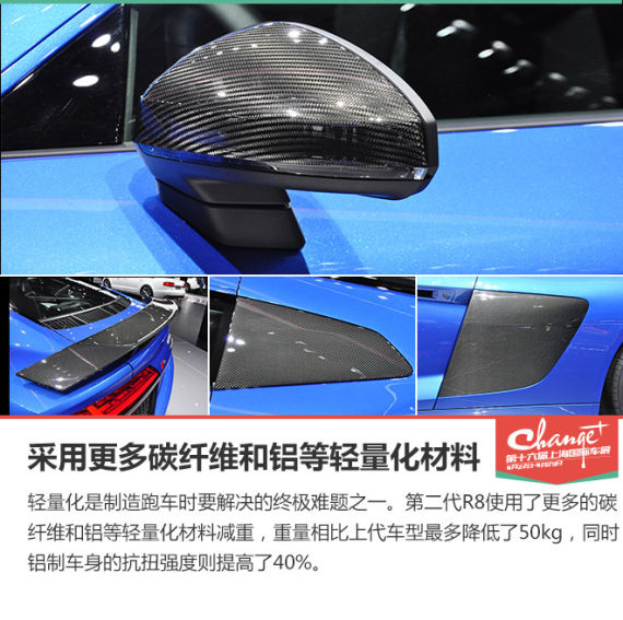 对于跑车来说,改款的最终目的就是更轻更快更强,新一代R8采用了大量铝制部件打造车身,这也是奥迪驾轻就熟的技术,同时还加入了更多碳纤维材料。车身轻量化之后,车身框架只有区区200公斤,V10普通车型的整车重量降到了1454公斤(现款V10手动车型为1635公斤),顶配车型则减轻了约50公斤的重量。