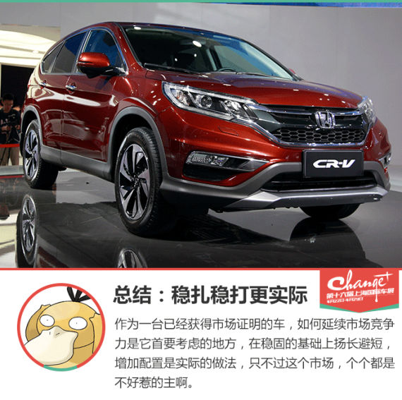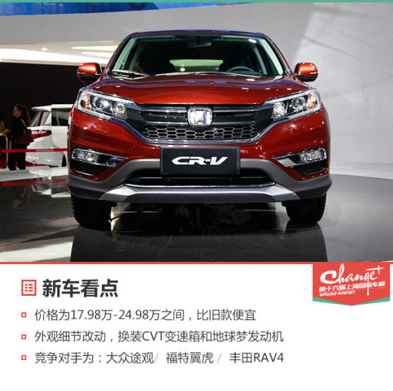 本田CR-V (配置|询价)发展到今天,已经是第四代车型了,本次上市的为改款车型,因此总体沿袭的还是四代车型的轮廓和车架,改动的地方包括外观、配置以及换装cvt变速箱和2.4L地球梦发动机。