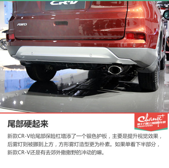 新款CR-V的中后部保持了原来的造型,只在一些细节处加以删改。此外,新车的颜色也增加到7个,多了赤霞红及琥珀棕两种车身涂装可供选择。