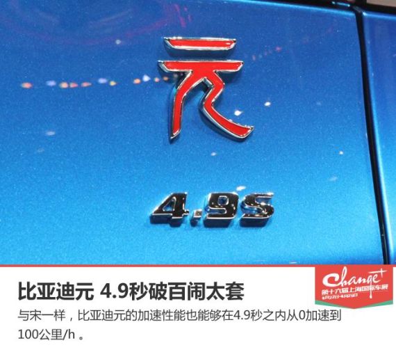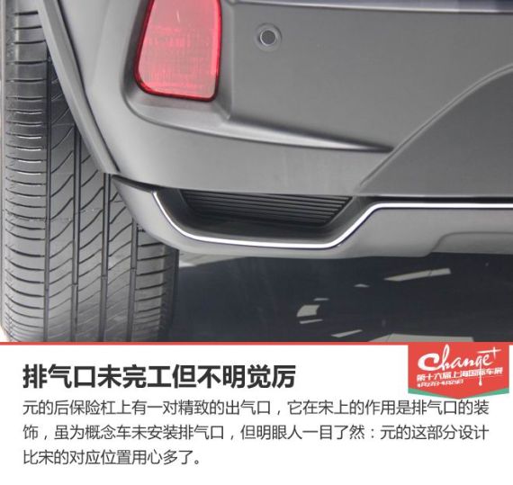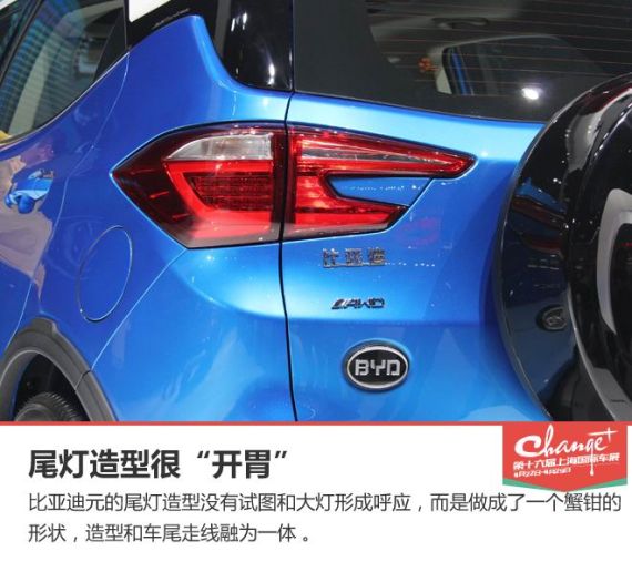 车尾部最明显是外挂式备胎,五条镰刀样式的装饰,给比亚迪元的运动气息增色不少。尾灯造型好像螃蟹的一对钳子。安装方式风格类似福特翼博。另外4.9秒的尾部标识同样出现在尾部,代表该车的0-100km/h所需的加速时间。