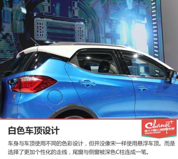 比亚迪元的定位是小型SUV,长宽高依次为4320/1765/1650mm,轴距为2520mm,与福特翼搏、雪铁龙C3-XR等水平相当。拍摄样车的蓝白配色效果出众,采用黑、银、蓝三色的多辐式轮毂也非常扎眼,博得了不少人的眼球。