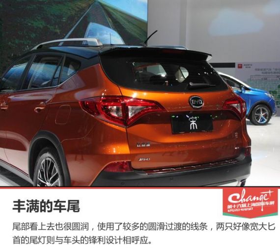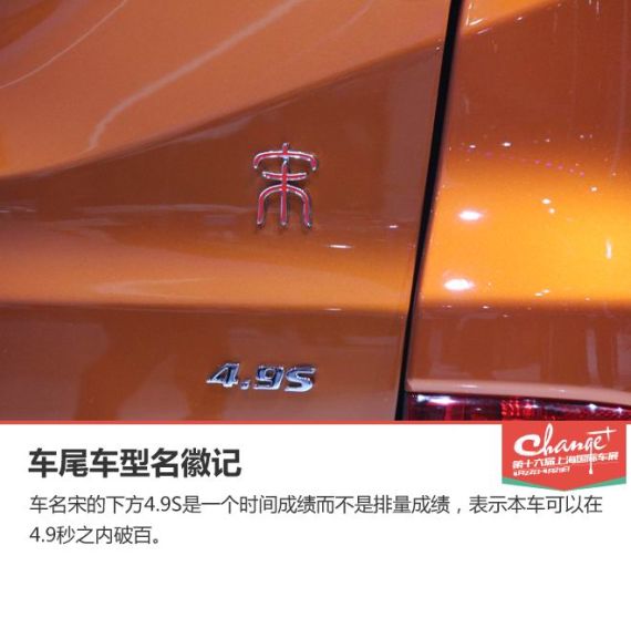 比亚迪宋的后部细节:尾部看上去也很动感,仍然使用了较多的圆润线条,两只好像宽大匕首的尾灯则与车头的锋利设计相呼应,双边单出的方形排气口显得比较有档次,尾部的4.9s字样尾标代表着它可以在4.9秒内完成0-100km/h的加速。