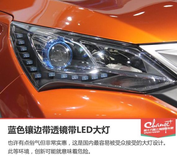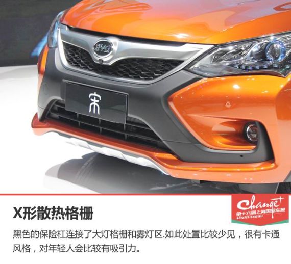 比亚迪宋的前脸设计非常凶悍,棱角分明的头灯和类似水牛角状的银色前格栅装饰条横向连接,大灯内部集成了LED日间行车灯,前格栅内部配有黑色网状饰板,显得很有层次感。一体式的前保险杠通过一个造型夸张的黑色X形“大嘴”与上部融合在一起,保险杠两侧配有雾灯。整体看起来,比亚迪宋的前脸造型比较有特点。
