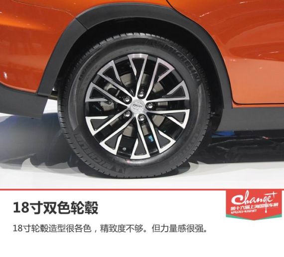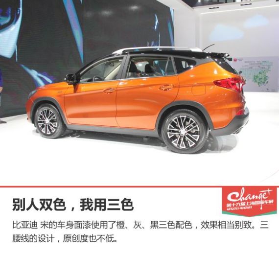 比亚迪宋的腰线的设计有点意思,两条不同走向的线条在后门把手处交错,立体感很强,双色的车身从侧面看也更加明显。