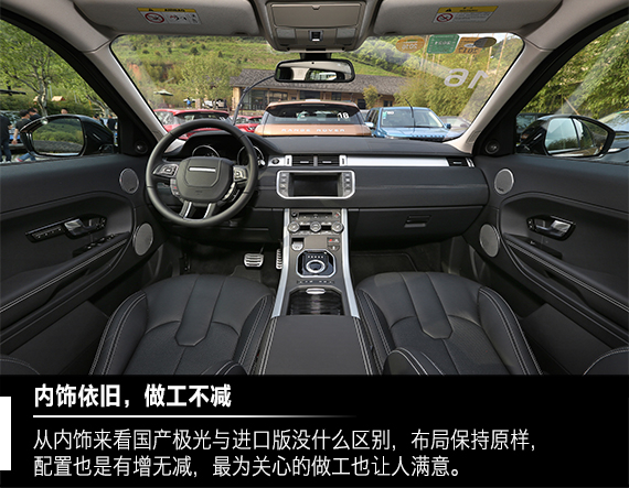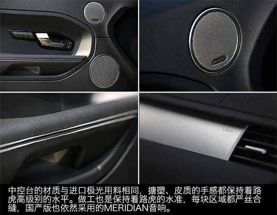 前面提到的第二个问题关于国产极光的品质,这不光包括耐用质量,还包裹内饰的用料和做工。仔细观察了一下奇瑞极光的内饰,我发现与进口车型并没有太多的差别,中控台上部的软性材料和皮质的手感与进口版基本相同,依然很上档次。而装饰板的材质也是一样,接缝和边角都保持着路虎的做工水平。关于做工这方面,奇瑞官方表示国产版极光严格按照英国路虎的制造标准,而且采用的是最新设备,所以国产车型的做工只会是有过之而无不及。