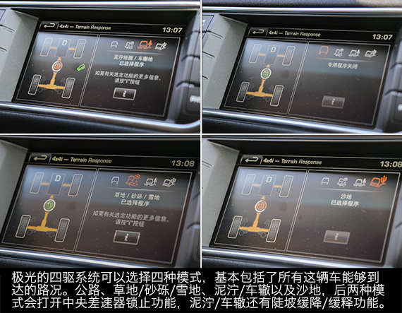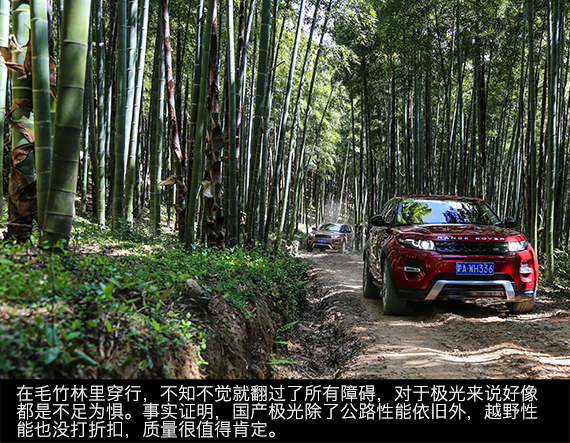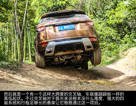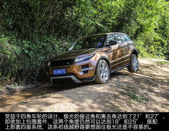 虽然越野路不适合极光来,但毫不费力的征服这样的路况,也充分说明了极光优异的性能,拥有路虎家族全路况四驱系统,让它拥有过人的通过性,加上超大的接近角和离去角,极光时尚个性的外壳下俨然是一副越野车的内在,如果它是承载式车身或者像发现那样装个副车架,它应该会成为一部非常强悍的越野车。