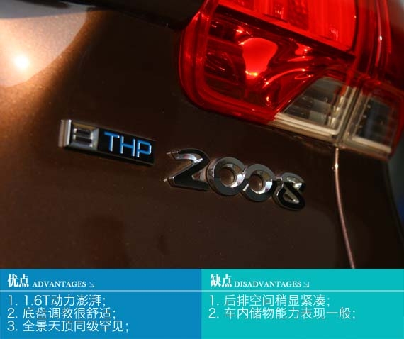 总结:虽然东风标致2008 1.6T车型入市较晚,但却来的非常自信,弥补上了先期仅提供1.6L的单一发动机的不足,在动力方面终于追上甚至超过同级对手,目前国内越来越多的涡轮增压引擎逐渐应用在了小型SUV的车上,但似乎都难以与2008的1.6T相媲美,而那些只有单一排量自然吸气的引擎车型,则在这方面更没有优势,1.6T的动力如虎添翼的匹配上了6速手自一体变速箱,让这款法式小资SUV变得更加完美。