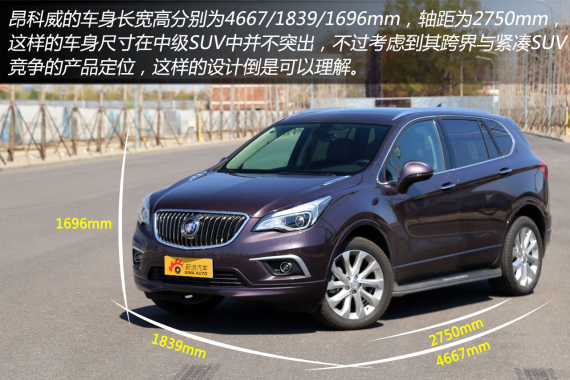 别克昂科威延续了ENVISION愿景概念车的设计元素,车身长宽高分别为4667/1839/1696mm,轴距为2750mm。这样的车身尺寸与其主要竞争对手途观和翼虎相比拥有十分明显的优势。另一方面,虽然昂科威轴距达到中型SUV的标准,不过和目前在售的中型SUV相比,昂科威的车身尺寸整体优势不大。而这与其跨级的定位有一定关系的。