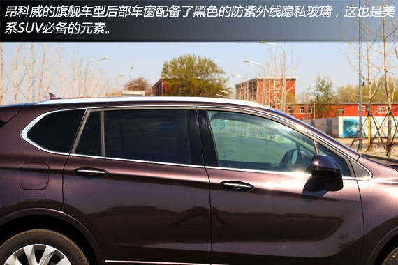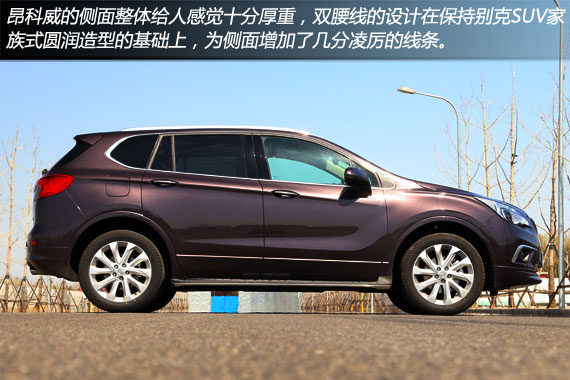 车身侧面,别克昂科威外后视镜布局在车门上,A柱位置配置固定式三角窗,减小侧前方的视线盲区。而为突出时尚风格的城市SUV气息,别克昂科威的车身包围采用了车漆同色喷涂,而不是通常的黑色包围设计。此外,车顶配备了贴顶式的金属风格行李架,还有前半部分可以滑动开启的全景天窗。