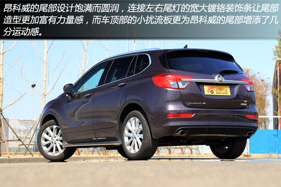 昂科威尾部风格与改款别克GL8有几分神似,牌照框上方的镀铬装饰条将尾灯组贯穿起来,尾灯组还采用了LED灯组配置。昂科威的后保险杠银色下护板两侧是外露的双出排气管,展示这款车型有着不错的动力系统配置。