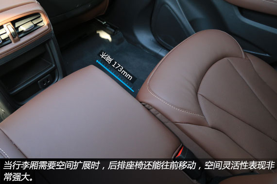 后排座椅坐垫比较长,基本照顾到了大部分人的身形,坐上去非常自在,乘坐的舒适性十分的优秀。而且当行李厢需要空间扩展时,后排座椅还能往前移动,空间灵活性表现非常强大。此外,昂科威的后排座椅靠背角度还能够调节,并且最小角度的设计在保证后备厢空间的同时也兼顾了后排乘客的乘坐舒适性。而空间表现方面,昂科威的后排乘坐空间表现同样比较出色的,180cm的体验者腿部尚有两拳的剩余空间,不过头部空间仅有一手掌厚度的空余,表现比较一般。此外,值得一提的是,别克昂科威的后排地板并没有明显的凸起,当后排乘坐三人时,中间乘客并不会感到不适,这对于一款四驱SUV来说实在难能可贵。